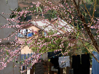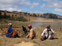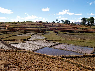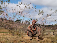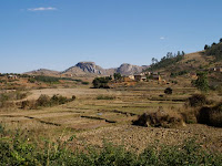 Balade en Betsileo avec Robin, sur les collines, dans les rizières, dans les villages. Plaisir retrouvé de la marche et du contact qu'elle permet d'avoir avec les gens. Partout, parfum des mimosas, d'eucalyptus, petites fleurs roses et délicates des pêchers, éclats de ciel dans les vallées.