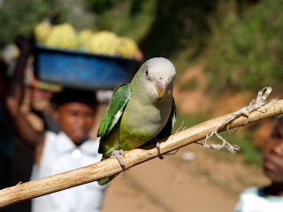Sur la rambarde devant le flamboyant, un petit lézard vert se délecte de la crotte laissée il y a quelques minutes par un autre petit lézard vert. Une petite pensée pour Pierre Marieu !...
