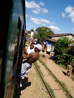 Train (Fianarantsoa-Manakara, l'une des toutes dernières lignes en activité à Mada; pendant la saison, comme maintenant, délire vazaha, armée d'appareils photos et de caméras DV - comme nous ! - à la fenêtre, du côté gauche, "le paysage est plus intéressant" précise le Routard... nous sommes du côté droit !...).